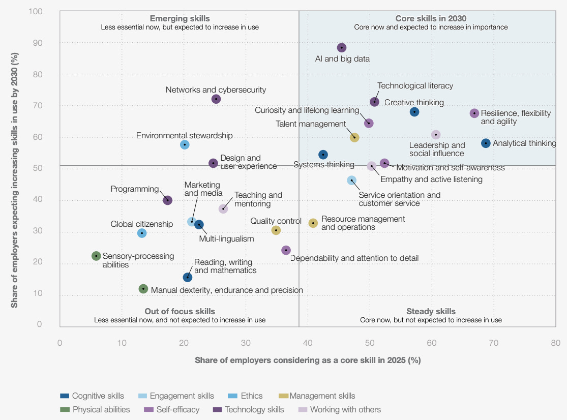 The data also highlights a set of “emerging skills” that are not yet widespread but will be central to the 2030 workplace. These include AI and big data, networks and cybersecurity, and environmental stewardship. Each reflects broader economic and social shifts: