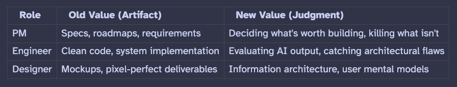 The PM who can go from customer insight to a validated prototype in a day. The developer who can evaluate, reshape, and stress-test AI output faster than the AI produces it. Both are operating as editors of AI output, not producers of artifacts.