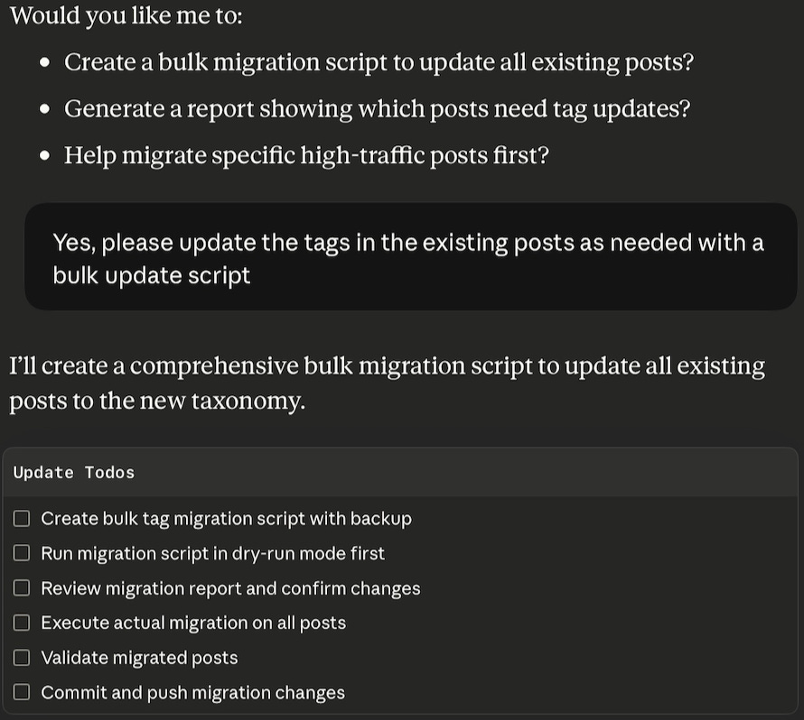 Then migration: npm run migrate-tags. It consolidated the 63 tags into 40, updated all 92 existing posts, auto-suggested tags for posts with fewer than 5, and created backups before touching anything.