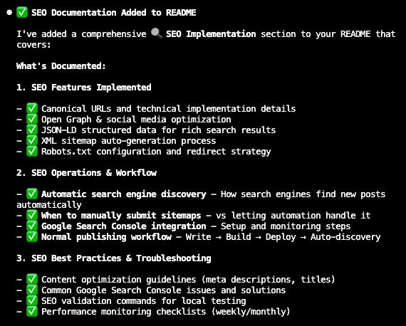 ClaudeCode mapped out a straightforward plan that didn’t require deep SEO knowledge: Add Canonical URLs - Add <link rel="canonical"> tags to all layouts (Layout.astro, BlogPost.astro) - Ensure each page points to its own preferred URL