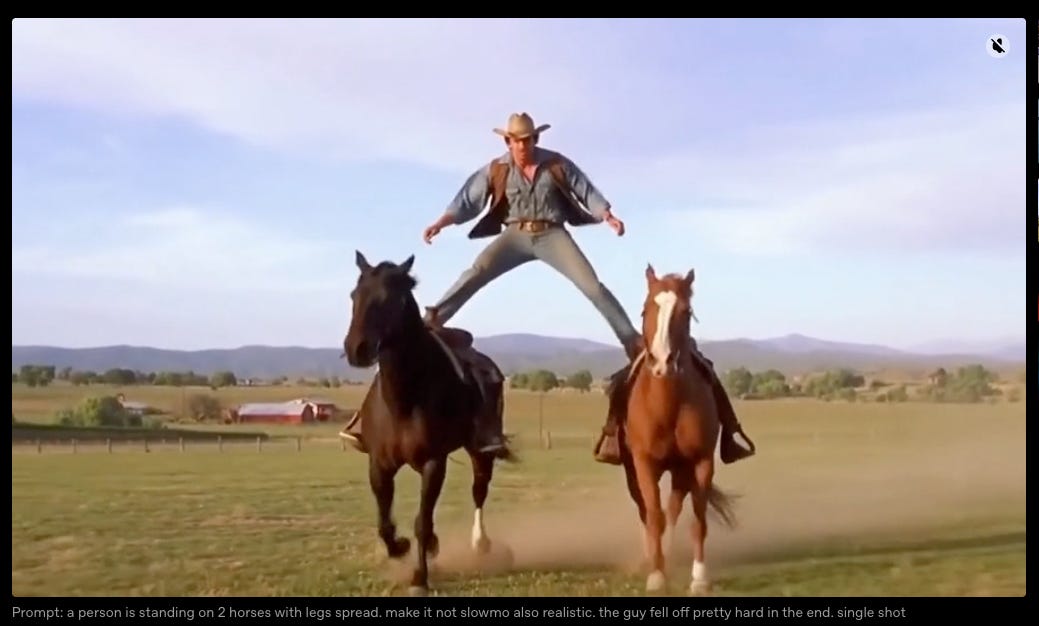 “A person is standing on 2 horses with legs spread. make it not slowmo also realistic. the guy fell off pretty hard in the end. single shot.”
