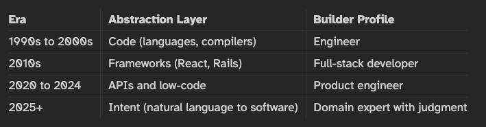 At each step, the barrier to entry dropped and the relevant skill shifted. When the abstraction layer was code, you needed an engineer. When it was frameworks, you needed a full-stack developer. When it was APIs, you needed a product engineer who could wire services together.