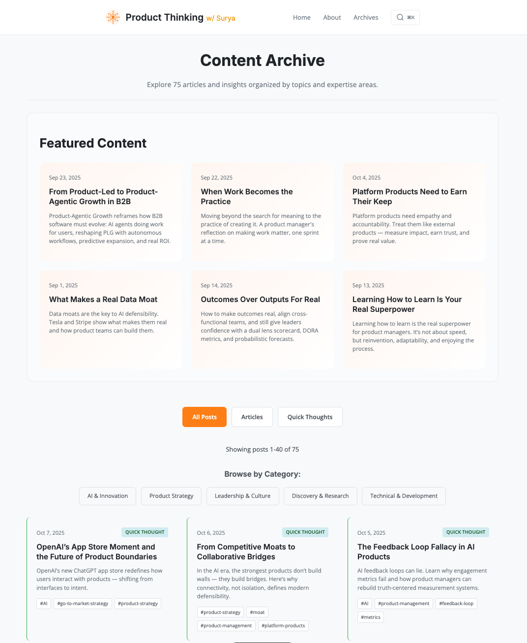 Three months in, I’ve been publishing daily, seventy-five posts and counting. What started as a clean, minimal blog revealed an obvious limitation: my archive page was sub-optimal. It simply listed every post in one long scroll with no way to filter by topic or type. As the number of posts grew, this design would not scale.