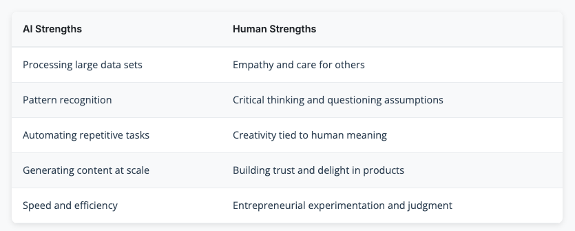Carnegie Mellon professor Po-Shen Loh puts it bluntly (video): “The only sustainable trait in the age of AI is the ability to care about people and act on it.”